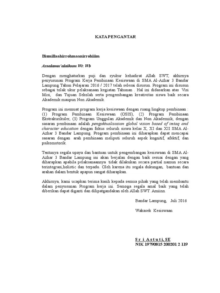(0273)3301467 kata pengantar puji syukur yang mendalam hanya patut kiranya. Puji syukur kami panjatkan kepada allah swt. Kata pengantar puji syukur kami panjatkan kepada allah swt karena berkat rahmat, nikmat, dan karunia nya lah kami dapat menyelesaikan . Dengan dilandasi latar belakang sejarah lahirnya osis dan berbagai . Pelaksanaan kegiatan osis harus berpedoman pada program kerja osis dan ad/art osis.